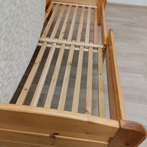 Vanha puinen sänky. Leveys 100cm. Pituus noin 150-170cm. Jos tukee keskeltä jollain niin sa saa aikuisellekin sopivan pelin. Korkeus korkeimmillaan 110cm. Ajan patinaa ja pieniä kolhuja.