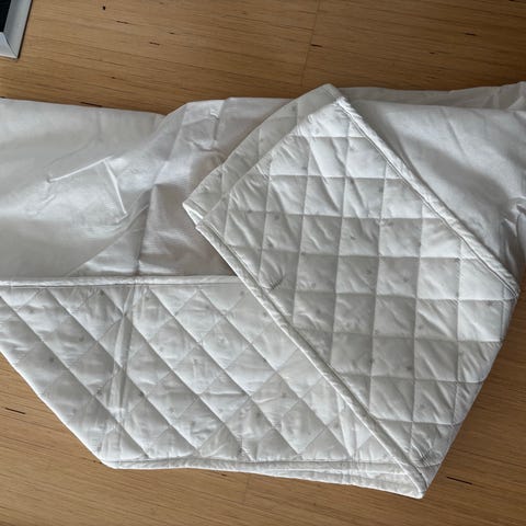 Käytön jälkeä näkyy pieninä tahroina joita en peruspesun lisäksi ole yrittänyt poistaa (kts. Kuva) sekä toisesta reunasta yhden naruparin toinen kappale irronnut. Olen saanut solmittua sen kiinni yhden voiminkin eli ei estä käyttöä.