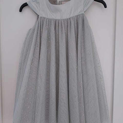 Pompdelux juhlamekko 122-128 vaaleansininen, jossa kultalankaa raitoina. Röyhelöolkaimet. Pituus melkeen nilkkoihin, toki riippuen lapsen pituudesta.