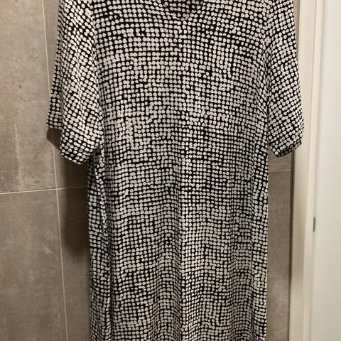 Miellyttävää ja laskeutuvaa 60 % cupro,40% viskoosi,ei jousta,3/4 hihat,taskut sivuilla,rusettikiinnitys niskassa.Mustalla pohjalla herkkiä kukkia. Koko 44, kai-kai 57 ja olka-helma 96,kerran pesty. Moitteeton kunto. Nouto tai lähetys,jolloin vastaanottaja maksaa postikulut.