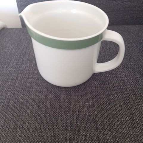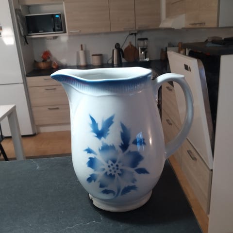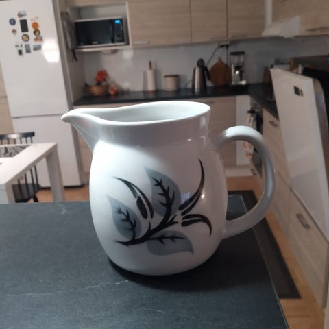 Tämä on Arabia Sininen Keittiö -sarjan maitokannu, jonka koristeen on suunnitellut Raija Uosikkinen.