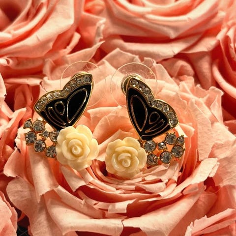 Sydän korvikset käsityömessuilla. Muut halppis rihkamaa. Isot kukkakorvikset ja säätösormus samaa sarjaa.