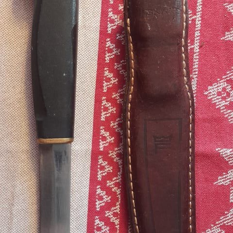 Fiskarssin hyväkuntoinen vanha puukko ja nahkatuppi, terän pituus 12 cm.