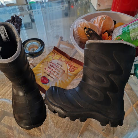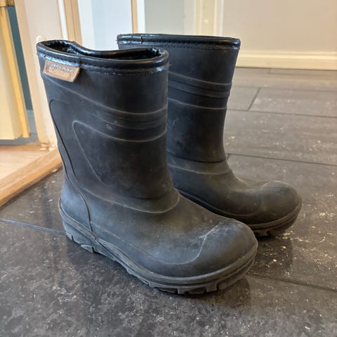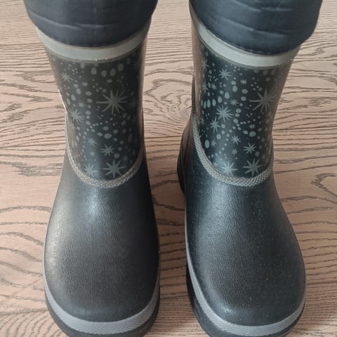 Nokian lasten lämpösaappaat / talvisaappaat, koko 32, unisex. Saappaat ovat mustat ja valmistettu vedenpitävästä materiaalista. Sisävuori on lämmin ja sopii kylmille ilmoille. Saappaissa on heijastinvaroitus. Pohjallinen ei irtoa, joten sisämitan kuva otettu siten, että on mitattu raksamitalla. Malli on todennäköisesti Wintry plus, mutta varrensuusta vain puuttuu kiristysnyöri. Lämmin karva koko saappaan ympäri! Tilava varvasosa! Paksu ulkopohja eristää kylmyyttä ja sen voimakas pohjakuvio pitää myös liukkailla keleillä. Pohjassa ura kurahousujen/haalarien kuminauhalle.