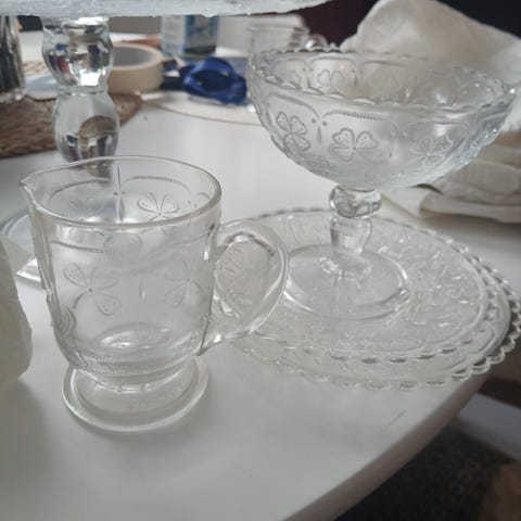Mukana jalallinen tarjoiluastia, 7 kuppia, 4 isompaa lautasta, 8 pienempää lautasta, 1 isompi jalallinen kulho ja 1 pienempi jalallinen kulho. Myydään settinä. Kaikissa ei ole tarroja jäljellä.