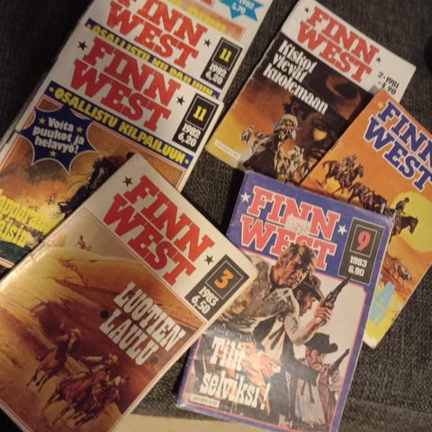 Lännen sarja lehdet. Kuvassa näkyy ainakin numero 7/1979, jonka nimi on "Lännen liukkaimmat luupäät". Länkkärihenkisiä sarjakuvalehtiä, joissa on villin lännen aiheisia tarinoita. Sopii kokoelmaan tai luettavaksi vanhoista lännenaiheisista kiinnostuneelle. 2€/kpl
