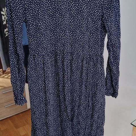 H&M arkimekko naisille, koko XS. Sininen puuvillamekko, jossa valkoiset raidat. Kaulus ja nappikiinnitys edessä, pitkät hihat. Malli on väljä ja pituudeltaan polven alapuolelle ulottuva, sopii arkeen ja rennoksi paitamekoksi.