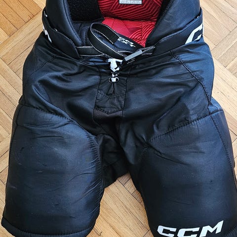CCM JR medium -kokoiset jääkiekkohousut. Väri musta. Toista lahjetta vähän paikattu, ei haittaa käyttöä. Resori ja pidentävä vetoketju. Suojaa tosi hyvin, sopii 142-157 -kokoiselle