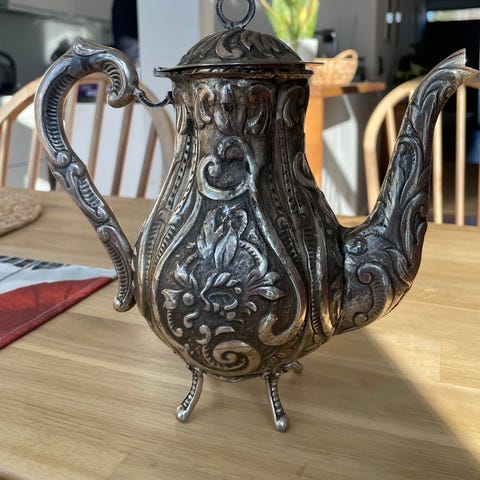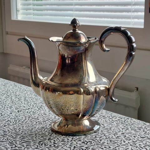 Hopeinen kahvikannu, sokerikko- ja kermakkoastia. Astioissa on leimat pohjassa, jotka kertovat hopeapitoisuudesta ja valmistajasta. Sisäpinnat ovat kullansävyiset, ulkopinta tummunut hopea. Sopii teen tai kahvin tarjoiluun sekä koristekäyttöön. Klassinen, koristeellinen muotoilu ja yhtenäinen sarja.