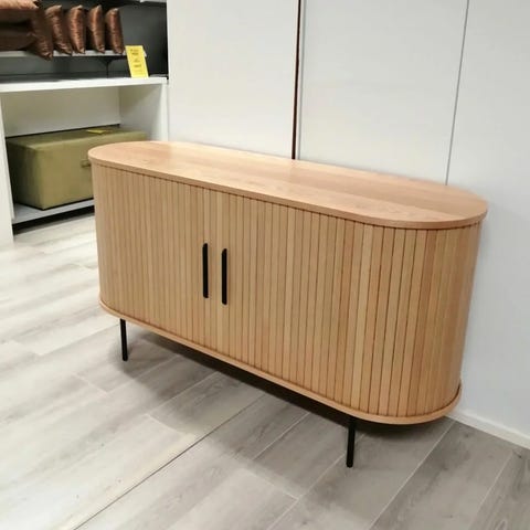 Upea ovaalinmuotoinen korkea Nola-senkki/kaappi tarjoaa tyylikkään ja toiminnallisen ratkaisun sisustukseen. Tammipaneelin, mustan metallin ja pyöristettyjen kulmien yhdistelmä luo tasapainoisen ja mielenkiintoisen ilmeen. Lisäksi tilaa säästävät liukuovet tarjoavat käytännöllisyyttä ja joustavuutta säilytysratkaisun käyttöön.