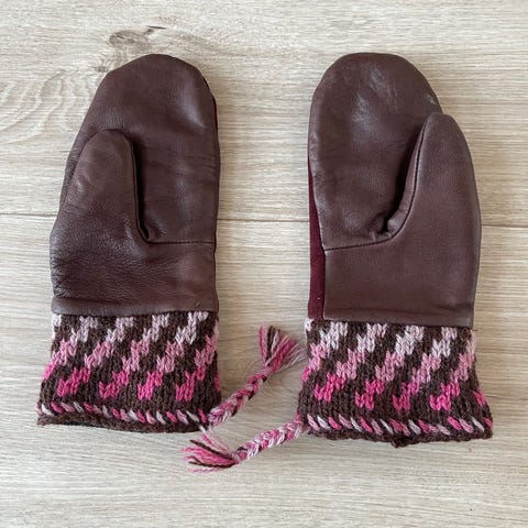 Kauniit ruskeat nahkarukkaset, kokomerkintä L mutta ovat pientä kokoa. Rukkasissa on lämmin karvavuori lampaankarvaa.