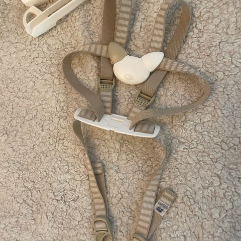 Stokke turvavaljaat lasten tuoliin. Beige-sävyiset säädettävät valjaat, jotka kiinnitetään tuoliin mukana tulevilla muoviosilla. Tarkoitettu lapsen istuma-asennon tukemiseen ja lisäturvaksi Stokken lasten tuoleihin valmistajan ohjeiden mukaisesti.