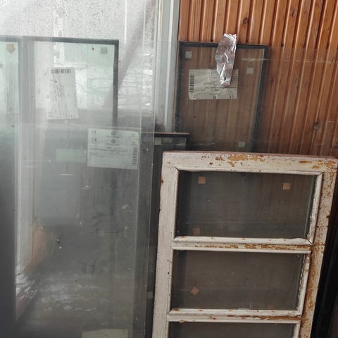 Annetaan kuvassa olevat, mökin seinustalle nostetut ikkunat. Mitat korkeus153cm × leveys 193cm ja korkeus 117,5cm×191cm.