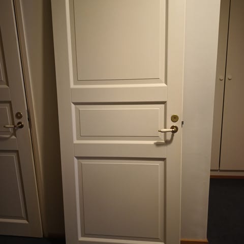 Kuvanmukainen valkoinen ulko-ovi. Valkoinen molemminpuolin, ulkopuoli vaatii fiksausta. Mitat 990x2290, karmi 115mm. Lukkorunko mukana.