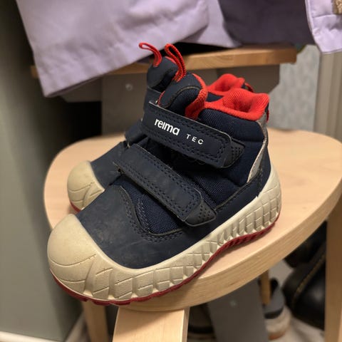 Reima lasten kengät, koko 22. Unisex-malli, jossa tummansininen päällinen ja punaiset pohjat sekä vuori. Kengissä on kaksiosainen tarrakiinnitys, joka helpottaa pukemista ja säätämistä. Pohjat ovat kumia ja niissä on selkeä kuviointi. Kenkien kärjissä ja kannoissa on vahvistukset. Pohjallinen lähtee irti. Sisämitta 14,7cm (Reiman ilmoittama tieto)