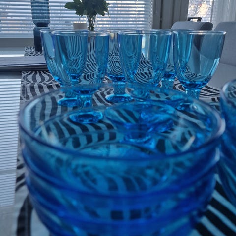 Iittala lasiastiat sininen. Kokoelma sisältää sinisestä lasista valmistettuja lautasia, kulhoja ja juomalaseja. Astiat soveltuvat kattaukseen ja tarjoiluun arkeen ja juhlaan. Sarja on yhtenäisen värinen ja osat ovat keskenään yhteensopivia.