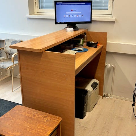 Valkoinen vastaanottotiski, jossa avohyllyjä ja vetolaatikko. Yläosassa taso, jonka päällä korotettu taustaosa. Sopii esimerkiksi toimisto- tai kampaamo käyttöön ja muiden tarvikkeiden säilytykseen. Materiaalina maalattu puulevy tai vastaava kalustemateriaali