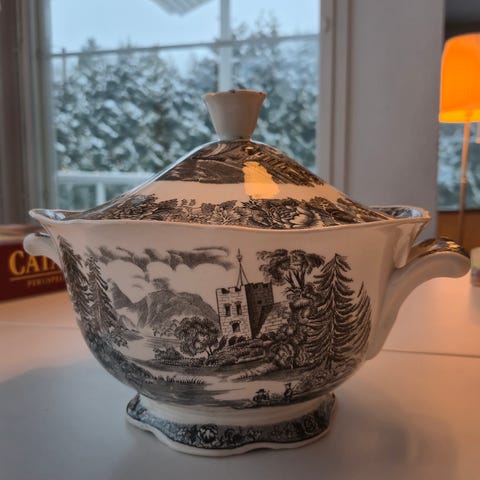 Arabian siniharmaa Maisema-sarjan kahvikannu. Ehjä, pieniä tummia jälkiä sisäpuolella. Kruunuleima pohjassa. Vain nouto Jyväskylän keskustasta. Korkeus ilman kantta n. 15 cm.