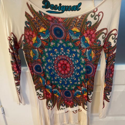Desigual hihaton tunika naisille, kokomerkintää ei ole mutta sanoisin S. Materiaalina puuvilla. Monivärinen, kirjavakuvioinen malli, jossa etu- ja takapuolella painatuksia ja kukkakuvioita. Epäsymmetrinen helma. Sopii hyvin esim legginsien kanssa.