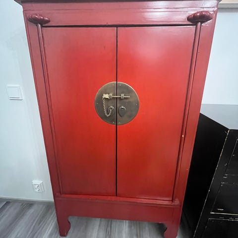 Punainen kaappi esim. liiketilaan, mutta myös kotiin. Väri hyvä punainen, hyllyt paksua vaneria ja liikuteltavissa eri korkeuteen, vaatteille tanko ja henkareille ripustustanko (myös liikuteltavissa).