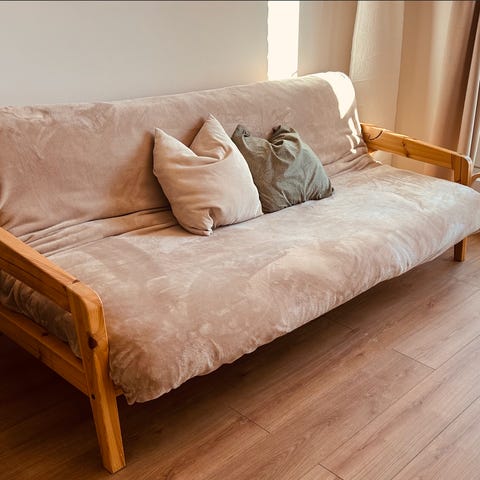 Patja muuten hyvässä kunnossa ja mukava istua, loikoilla ja nukkua (hyvä vierasänky). Myyn, koska ei mahdu asuntooni.