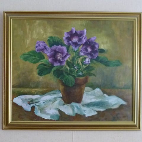 Kaunis taulu, jossa on kukka-asetelmaa esittävä maalaus. Kuvassa on vaaleita ja värikkäitä kukkia maljakossa neutraalia taustaa vasten. Korkeus 60 cm, leveys 52 cm. Vain nouto