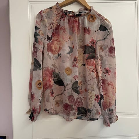 Vila kesämekko, koko S. Monivärinen kukkakuviointi tummanruskealla pohjalla. Materiaali polyesteriä. Mekossa on pitkät hihat ja takaa kivasti auki ylhäältä, muuten takana napit.