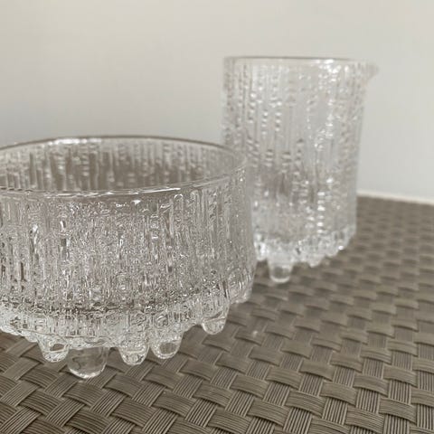 Tapio Wirkkalan Iittalalle suunnitteleman Ultima Thule-sarjan sokerikko ja kermakko. Myynnissä olevat sokerikko ja kermakko ovat ehjiä ja uudenveroiset. Sokerikon korkeus on 5 cm, halkaisija 8 cm ja tilavuus 10 cl. Kermakon korkeus on 8 cm, halkaisija 5,5 cm ja tilavuus 10 cl.