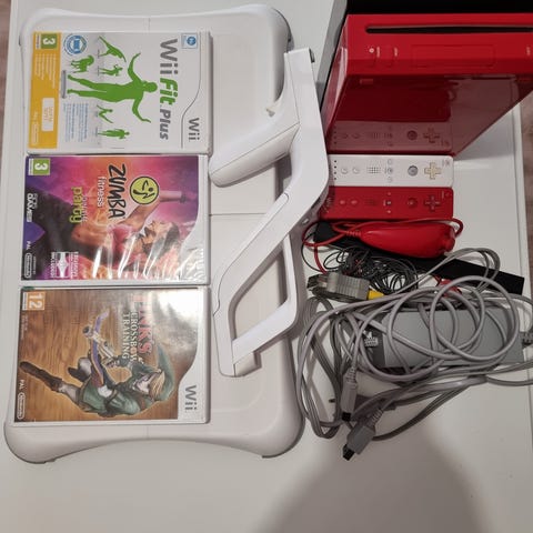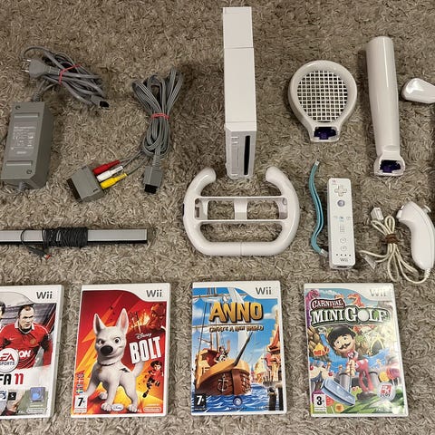 Nintendo Wii pelikonsoli valkoisena. Mukana kolme Wii Remote -ohjainta rannehihnoilla, kolme Nunchuk-lisäohjainta, kaksi rattiohjainta sekä Wii Balance Board -tasapainolauta. Pelejä mukaan 12 kpl, joilla pääsee hyvin alkuun. Kaikki tarvittavat kaapelit, virtalähde ja liikesensori mukana. Lisäksi mukaan tulee tanssimatto, mutta siihen ei ole pelejä, joten sen toimivuutta ei ole voitu testata. Myydään pakettina.