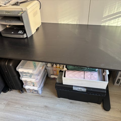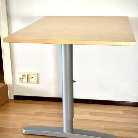 Iso työpöytä säädettävillä jaloilla. Säätövara yli 70 senttiä. Pöytä on siistissä kunnossa, joitain pieniä jälkiä on levyn reunoissa. Levytason yksi muovi-insertti on korkannut, mutta levy pysyy hyvin paikoillaan ilman yhtä ruuviakin.