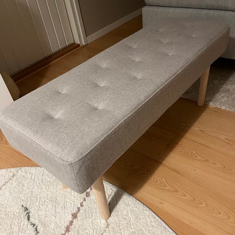 Myytävänä Elloksesta aikoinaan tilattu hyväkuntoinen harmaa kankainen napitettu penkki jossa puiset jalat. Saa tulla katsomaan ennen ostopäätöstä.
