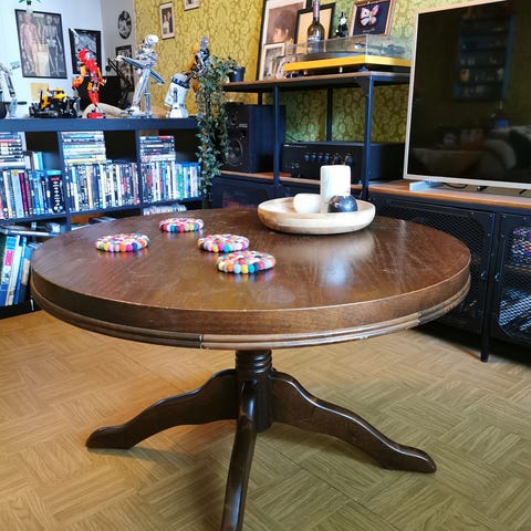 Pyöreä valkoinen sohvapöytä puisilla jaloilla. Tukeva ja ehjä, muutama pieni kauneusvirhe kannessa (ks. kuva) mutta yleisilme siisti. Nouto Hervanta tai kulkeutuu Pirkkalaan.