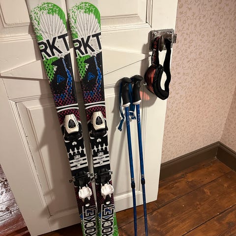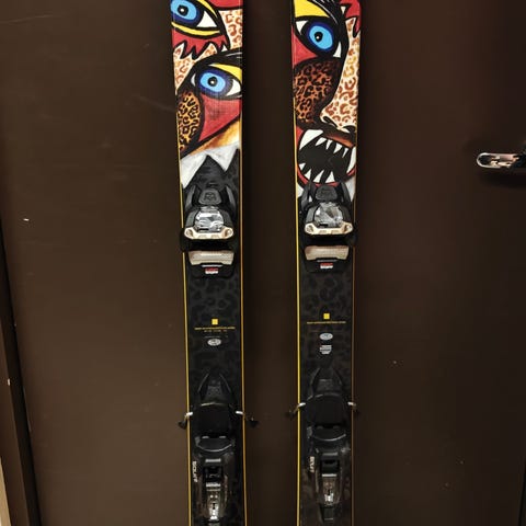 Sukset ja siteet on käytetyt mutta täysin ehjät, perus kulumaa.
