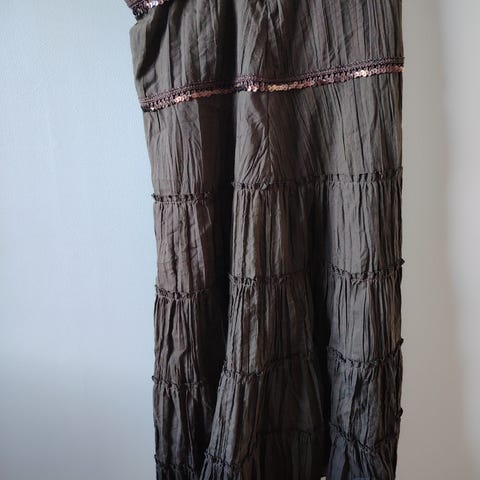 Kevyt ja kauniisti laskeutuva kangas, jossa sinisen, vihreän ja ruskean sävyinen kukkakuosi. Vyötäröllä joustava kuminauha ja vetoketju, joten istuu mukavasti päälle. Kangas on vähän satiinin/silkin tuntuinen (en tiedä kankaista paljoa)