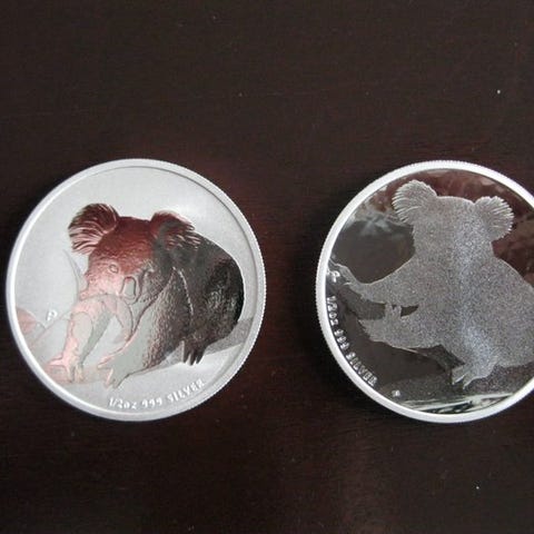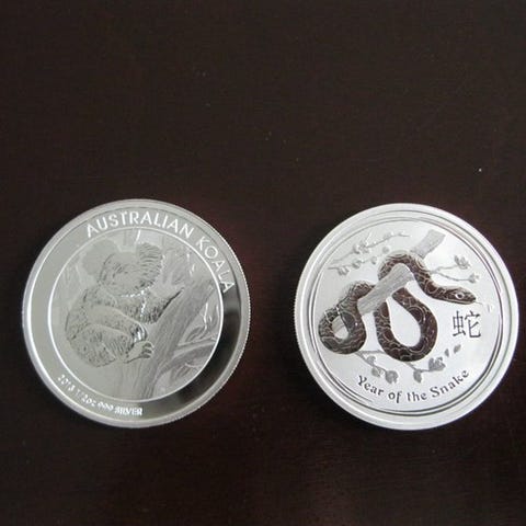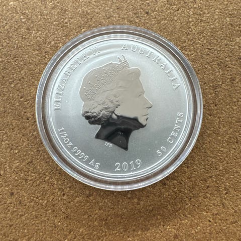 Australian Kookaburra hopearaha, vuosimalli 2013. Kolikko on valmistettu 1 unssin (1 oz) 999 hienohopeasta. Nimellisarvo on 1 Australian dollari. Toisella puolella on kookaburra-aiheinen kuva ja teksti "Australian Kookaburra", toisella puolella kuningatar Elizabeth II:n profiili sekä maa- ja valuuttamerkinnät. Kolikko on suojakotelossa.