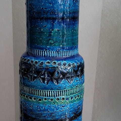 Myydään hyväkuntoinen näyttävä iso keittiö- / säilytyspurkki, jossa niin herkulliset hehkuvan siniset sävyt. Italial. Aldo Londin 1960-luvun tuotantoa. Lasitettu kauttaaltaan myös purkin sisäpuolelta että kannen alapuolelta. Purkki ollut vain koristeena ja on tuoksuton, joten käy yhä ihan minkä säilytykseen vain, myös keittiössä elintarvikkeiden.