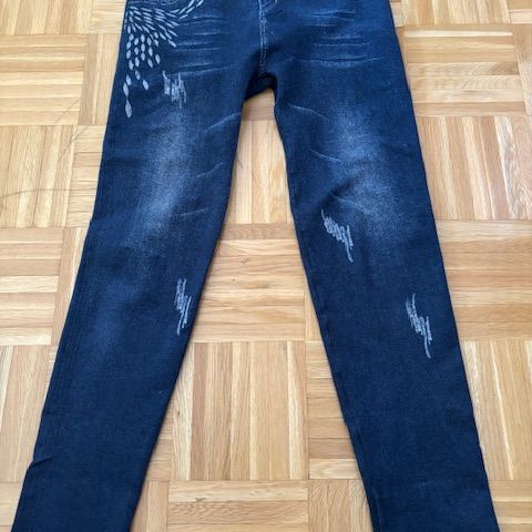 Myynnissä uutta vastaavat naisten kiiltäväpintaiset farkkutyyppiset housut, koko M.