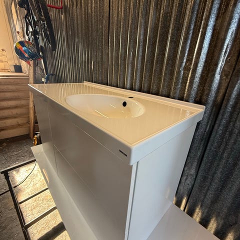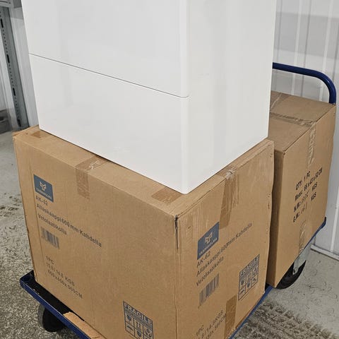 Uusi, koskematon allaskaappi paketissa. Avattu kantta vain kuvaa varten.