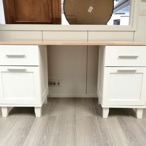 Monipuolinen Viiva-työpöytä saadaan asettamalla jalallinen kirjoitustaso ilman kiinnitystä 3-laatikkoisen valkoisen sokkelijalallisen lipaston päälle. Tarpeen tullen lipaston voi siis ottaa käyttöön helposti myös ilman kirjoitustasoa.