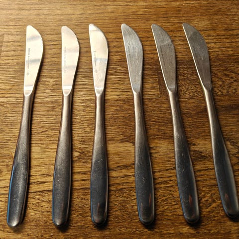 Hackman Savonia aterimet . Veitset haarukat ja ruokalusikat, kaikkia on 7kpl eli yht 21kpl. Haarukoissa on 3eri sarjaa ja yhdessä veitsessä lommo .