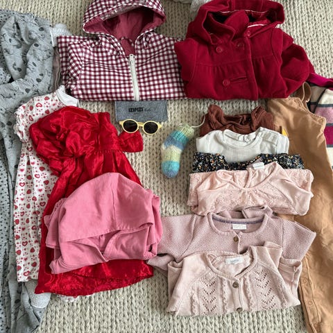 Monipuolinen vaatesetti koossa 74-86 (+ yksi pienehkö 92). Kuusi lyhythihaista bodya, viisi pitkähihaista bodya (kaksi kietaisumallista), kolmet housut (yhdet kaprimittaiset), neljä mekkoa/tunikaa, kaksi neuletakkia, kolme paitaa, yksi huppari, kaksi lyhythihaista pyjamaa ja kaksi pitkähihaista pyjamaa.