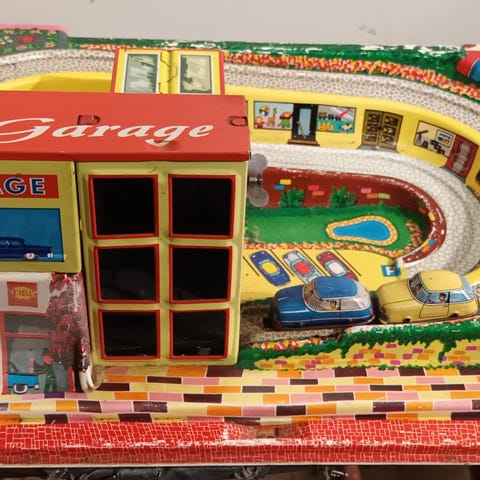 Parkkitalon mitat: leveys 50, syvyys 27 ja korkeus 31 cm. Mukaan saman aikakuden autoja. Hissi ja puomi toimii. Lelu löytyy Kauppakeskus Minnan koti-irtaimiston pop up-puodista 7.3. asti.