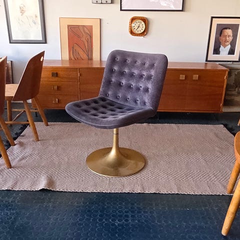 Sininen Yrjö Kukkapuron tuoli. Näyttää hyvälle. Osassa kankaasta pientä nukkaumaa mutta ei oikein huomaa.