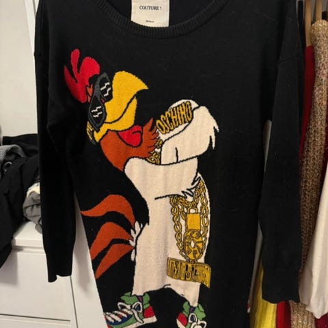 Moschinon ja H&M yhteistyömalliston Minnie Mouse -neulemekko, 100% merinovilla. Koko S, kainalo-kainalo 55cm, niska-helma 85cm. Muuten ehjä ja siisti, mutta yksi pieni reikä paikattu (kts kuvat, huomioitu hinnassa). Taitava osaisi paikata vielä siistimmin, mutta ei tämäkään juuri yleisilmeessä näy.