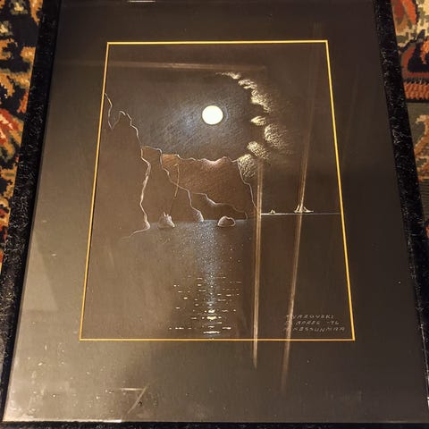 Raimo Huddin pieni maalaus vuodelta 2009. Koko kehyksineen 17x22cm.