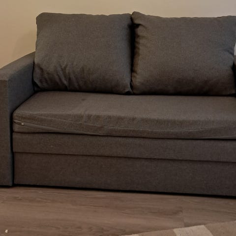 Kangaspäällysteinen punainen vuodesohva. Leveys 208cm, syvyys 90cm.