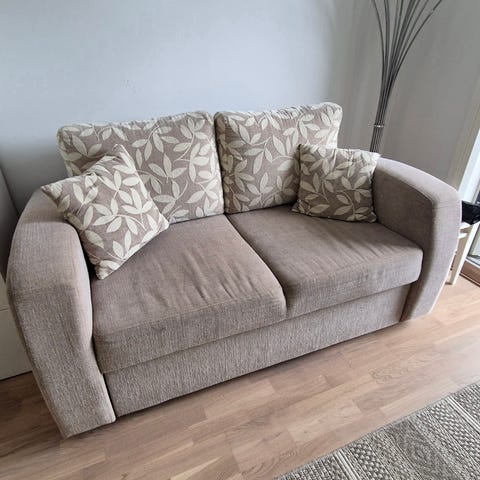 Valkoinen kahden istuttava vuodesohva. Irrotettavat päälliset.