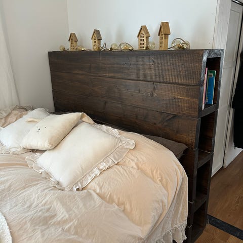 Täysipuinen sängynpääty parisängylle. Keskiosa tehty vanhoista puuovista. Sisältää metallisen koristeen ja 9 kpl:tta led-valoja, joista 5 toimii. Uusimalla koko valosarjan, saa toimivat valot taas pitkäksi aikaa. Sängynpäätyyn on tehty pähkinäpuu mukailumaalaus. Pientä kulumaa maalipinnassa.