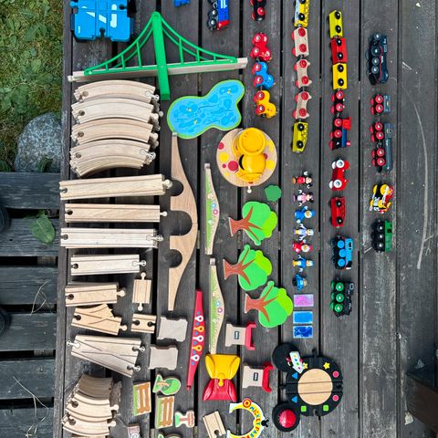 Oheinen setti Brion junaradan osia ja jonkinlainen veturi ja kaksi vaunua.