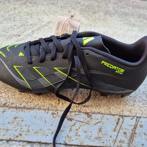 Adidas F50 Club FxG jalkapallokengät. Kengät on tarkoitettu jalkapalloon kiinteille alustoille (FxG). Koko EU 42 2/3 (UK 8,5, US 9). Väri pääosin valkoinen sinisillä ja punaisilla yksityiskohdilla. Nauhakiinnitys ja matalavartinen malli. Pohjassa moninappulainen kuviointi, joka on suunniteltu antamaan pitoa luonnonnurmella ja mahdollisesti myös kovemmilla alustoilla valmistajan ohjeen mukaan. Kengät toimitetaan alkuperäisessä Adidas-kengänlaatikossa.